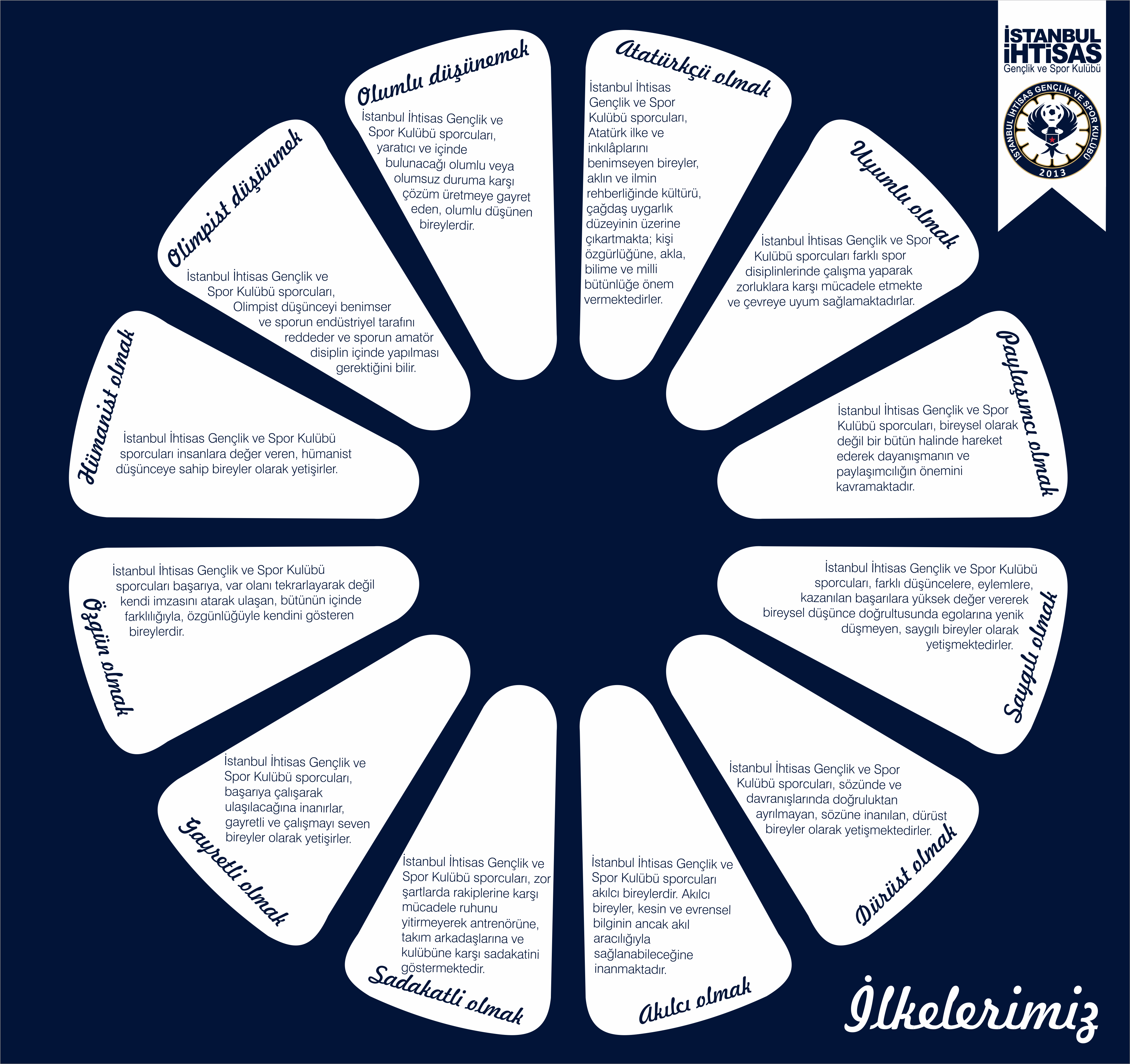 İstanbul İhtisas Gençlik ve Spor Kulübü sporcuları, farklı düşüncelere, eylemlere, kazanılan başarılara yüksek değer vererek bireysel düşünce doğrultusunda egolarına yenik düşmeyen, saygılı bireyler olarak yetişmektedirler.